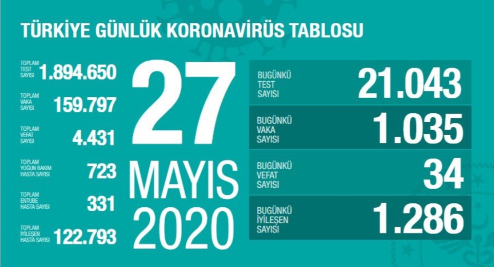 Sağlık Bakanlığından yapılan açıklamaya göre, son 24 saatte 34 kişi korona virüsten hayatını kaybetti, toplam can kaybı ise 4 bin 431'e yükseldi. Bugün toplam 21 bin 43 test yapılırken, bin 35 yeni vaka tanısı konuldu, toplam vaka sayısı ise 159 bin 797 oldu. Bugünkü bin 35 kişiyle birlikte toplam iyileşen sayısı da 122 bin 793'e yükseldi. Toplam entübe hasta sayısının 331, toplam yoğun bakım hasta sayısının ise 723 olduğu açıklandı.