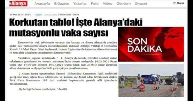 “Korkutan Tablo! İşte Alanya’da mutasyonlu vaka sayısı” isimli haber paylaşımda . Alanya’da belirli tarihler arası karantina uygulanacağı belirtildi. Hıızla yayılan görsel vatandaşlar arasında panik yaşattı .