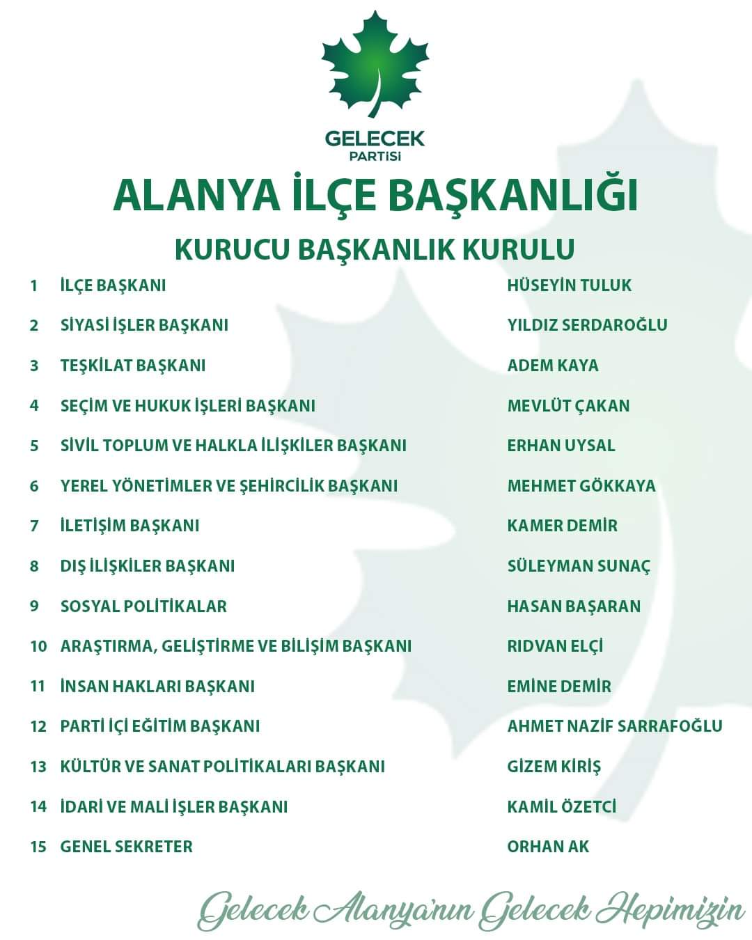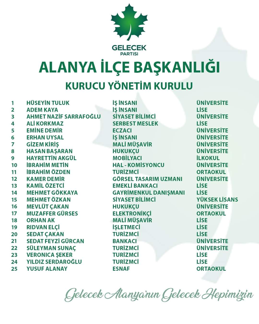 Gelecek Partisi Alanya İlçe Yönetim Kurulu'nda ise şu isimler bulunuyor: