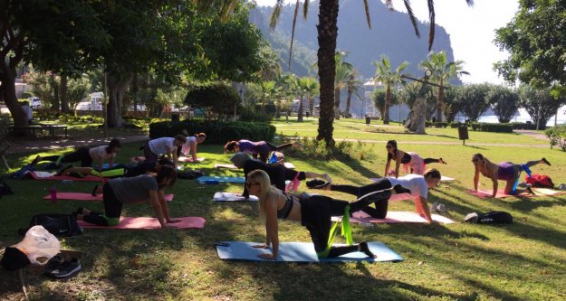 30 kişinin katıldığı pilates kursiyerleri, açık havada pilates yapmaktan son derece keyf aldılar.