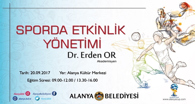 Alanya Belediyesi Spor Müdürlüğü tarafından 20 Eylül 2017 tarihinde 9.00-12.00/ 13.30-16.00 saatleri arasında tam gün olarak Alanya Kültür Merkezinde Akademisyen Dr. Erden Or tarafından "Sporda Etkinlik Yönetimi/Spor Müsabakalarında Beden Eğitimi Öğretmenlerinden Beklentiler" konulu eğitim verilecek.