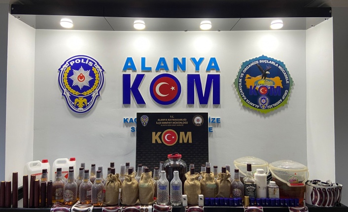 Alanya Kom Grup Amirliği'nin Alanya genelinde gümrük kaçağı ve sahte alkol üretimi ile satışının önlenmesine yönelik yaptığı araştırmalarda G.Ö (27) isimli şahısın Güllerpınarı Mahallesindeki ikametinde sahte alkol yaparak piyasaya sürdüğü tespit edildi. Polis ekipleri tarafından söz konusu adrese baskın düzenlenmiş ve şüpheli şahısın ikametinde yapılan aramada: 24 adet 70Cl boyutunda üzerinde herhangi bir bandrol bulunmayan Viski şişesi 9 adet 100Cl boyutunda üzerinde herhangi bir bandrol bulunmayan Viski şişesi 25 litre şişelenmek üzere hazırlanmış kovalarda olan Viski 20 adet çeşitli ebatlarda boş içki şişesi 68 adet metal bilyeli kapak 5 adet siyah renk viski kapağı 300 adet viski şişesi kapak kapşonu 230 adet alkol şişesinin üzerine yapıştırılan kapak etiketi 500 adet alkol şişesine yapıştırılan etiket 2 adet 20ml sahte alkollü içki yapımında kullanılan aroma 1 adet sahte alkollü içki yapımında kullanılan aroma bulunarak el konuldu. Şüpheli şahıs emniyetteki işlemlerinin ardından çıkarıldığı mahkemece tutuklanarak cezaevine gönderildi.