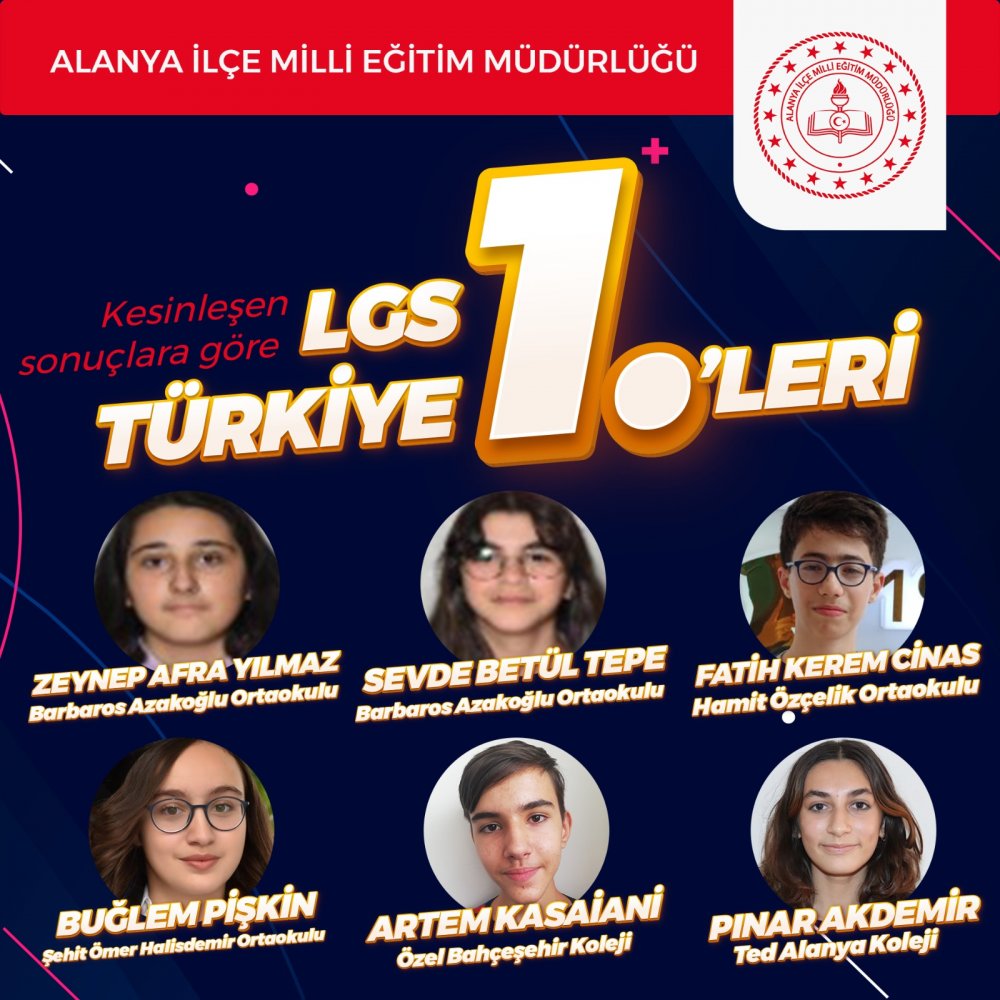 Alanya’da 4 Haziran’da Liselere Geçiş Sistemi (LGS) toplam 68 okulda 290 salonda 4 bin 785 öğrenci katılımıyla gerçekleştirilmişti. LGS’ye giren adaylara Türkçe’den 20, inkılap tarihinden 10, din kültürü ve ahlak bilgisinden 10, yabancı dilden 10, matematik ve fen bilimlerinden 20’şer soru sorulmuştu. LGS sonuçları bugün açıklandı. Buna göre Alanya’dan 6 aday tüm soruları doğru cevaplayarak 6 Türkiye birincisi çıkardı. Alanya İlçe Milli Eğitim Müdürü Yusuf Yılmaz, “LGS sonuçları açıklandı. 6 Türkiye birincimiz tescillendi” dedi.