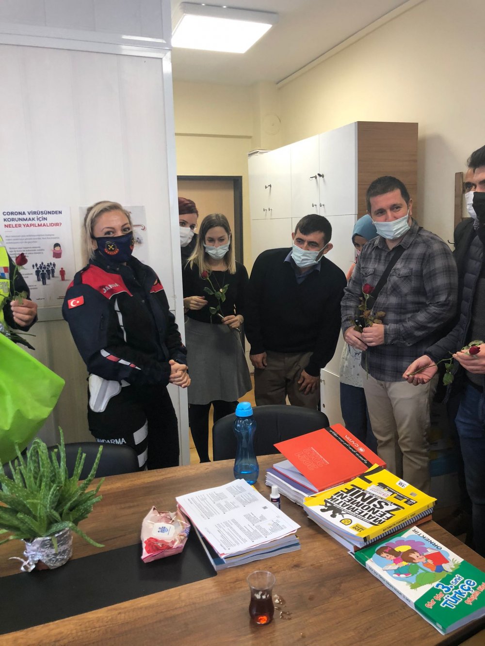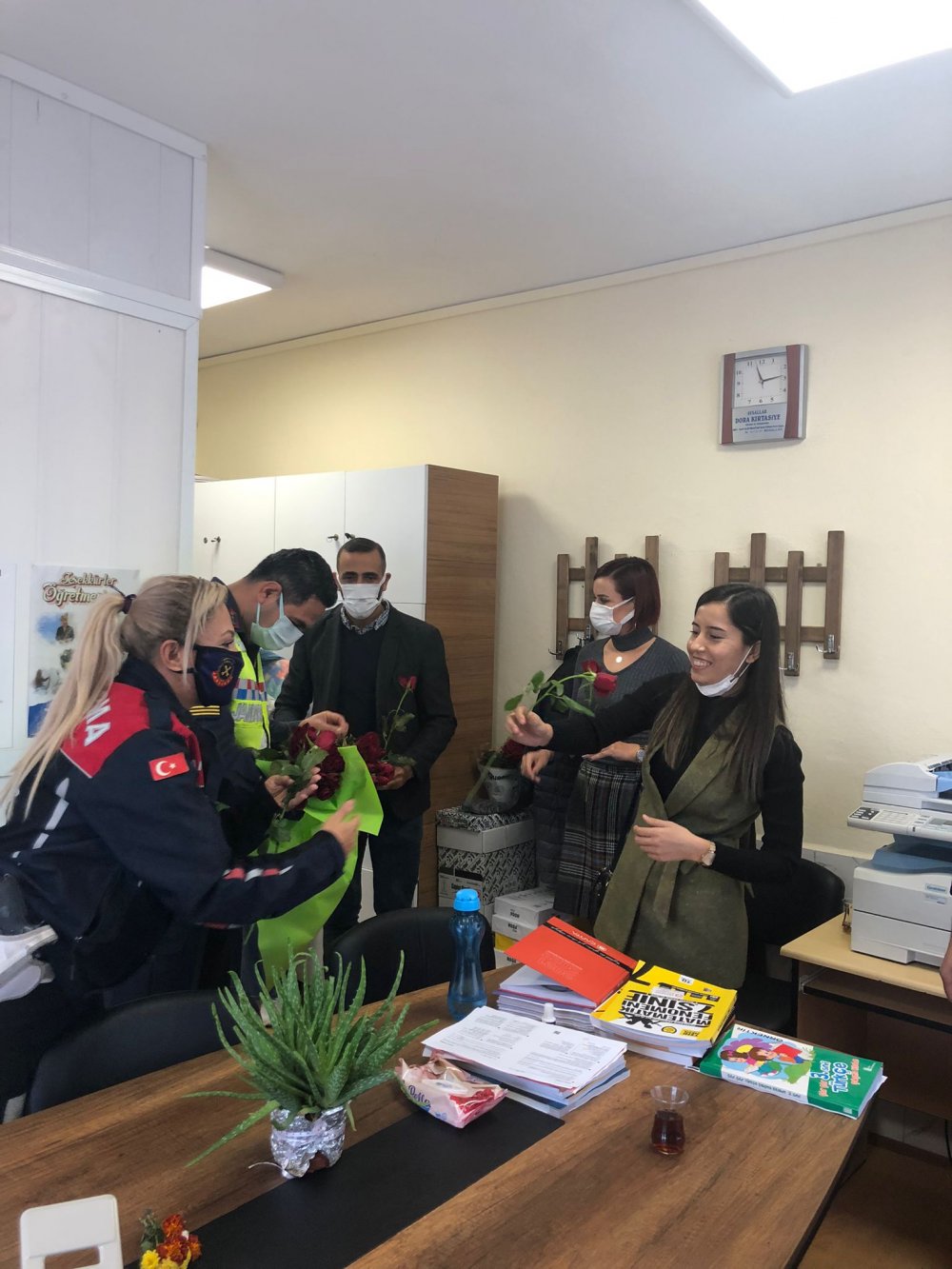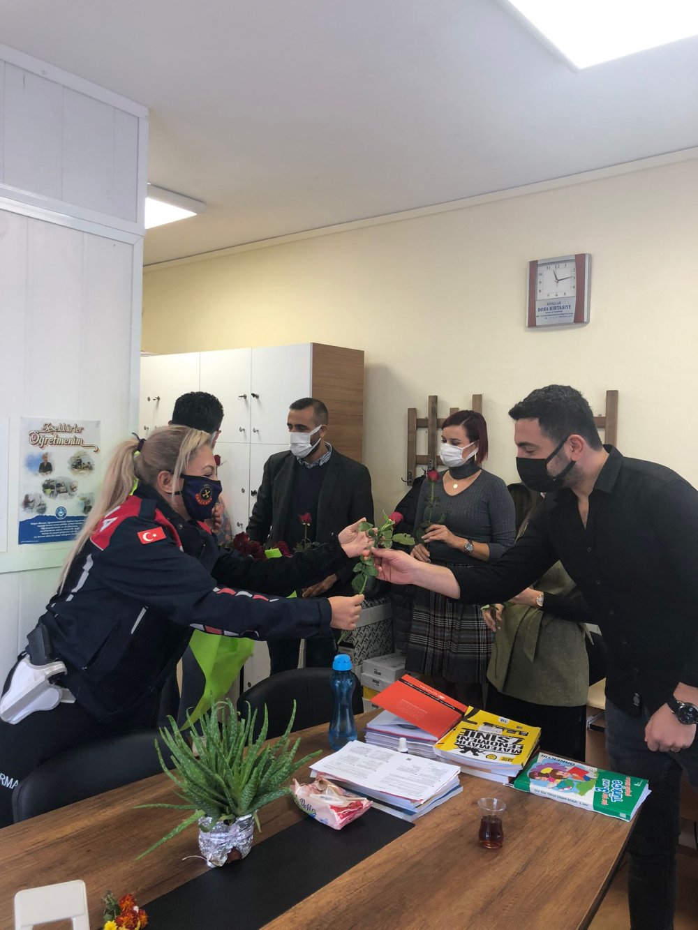 Alanya İlçe Jandarma Komutanlığı’na bağlı trafik ekipleri, 24 Kasım Öğretmenler günü dolayısıyla Türkler’de bulunan Aynur Hasan Sipahioğlu ilk ve ortaokulunu ziyaret edip öğretmenlere çiçek vererek günlerini kutladı. Öğretmenler bu jest karşısında jandarma ekiplerine teşekkür ettiler.