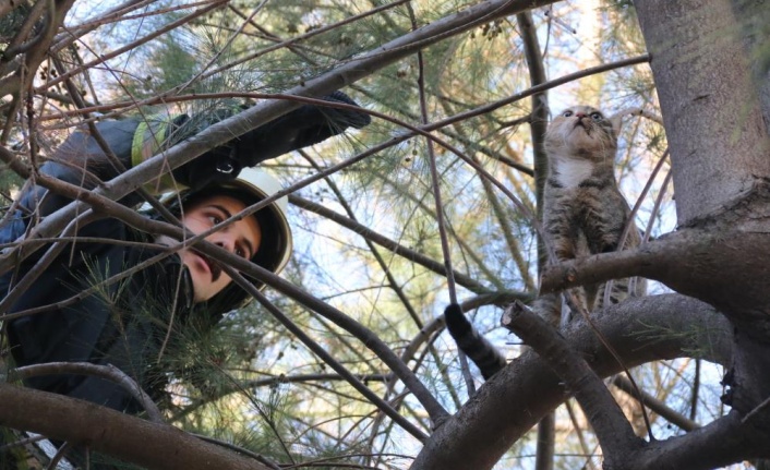 10 metrelik çam ağacında mahsur kalan kedi, ekiplere zor anlar yaşattı