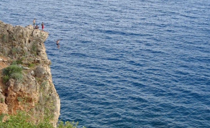 Turizm şehri Antalya'da, artan hava sıcaklıklarıyla birlikte dünyaca ünlü Konyaaltı Sahili vatandaşların ve tatilcilerin akınına uğruyor. Günün her saati dolu olan sahil, adrenalin seven gençlerin de uğrak noktası oluyor. Bazı gençler falezlerin altındaki küçük kaya üzerinden denize atlarken, bazıları ise macera uğruna falezlerin uç noktasına geldi. Bir süre falezlerin uç noktasında konuşan ve birbirlerine cesaret veren gençlerden ikisi kendini ayaklarının üzerinde denize bıraktı. Tehlikeli ve sert bir şekilde suya düşen gençler, daha sonra yüzerek kıyıya çıktı. İki genç atlamak için gelse de arkadaşlarının tavsiyesiyle vazgeçti.