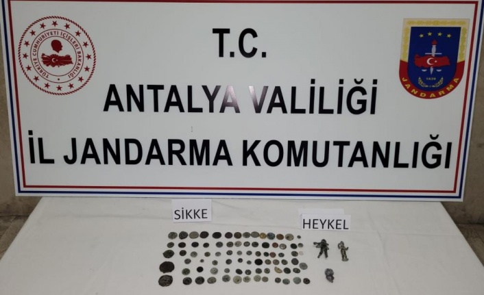 Antalya İl Jandarma Komutanlığı İstihbarat Şube Müdürlüğü, Manavgat ilçesi, Side Mahallesinde T.H. ve C.T. isimli şahısların ellerinde bulundurduğu tarihi eserleri piyasaya sürmeye çalıştığı bilgisini aldı. Alınan bilgi üzerine İstihbarat Şube Müdürlüğü ve Manavgat İlçe Jandarma Komutanlığı ekipleri tarafından şüphelilerin yakalanmasına yönelik düzenlenen operasyonda Roma dönemine ait olduğu değerlendirilen; 79 adet sikke, 3 adet heykel olmak üzere toplam 82 parça tarihi eser ele geçirildi. Tarihi eser kaçakçılığı yapan T.H. ve C.T. isimli şahıslar yakalandı. Olayla ilgili adli işlemler başlatıldı.