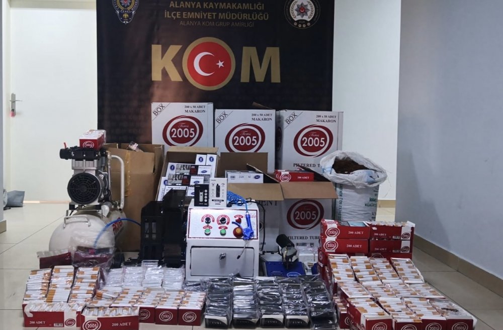 Alanya İlçe Emniyet Müdürlüğü Kaçakçılık ve Organize Suçlarla Mücadele Grup Amirliği (KOM) ekipleri Hacet Mahallesi’ndeki işyeri ve Güllerpınarı Mahallesi’ndeki evden piyasaya kaçak tütün sürüldüğü bilgisi üzerine çalışma başlattı. Belirlenen adreslere baskın düzenleyen polis, 10 kilogram kaçak tütün, kaçak tütünle doldurulmuş 30 bin 880 adet makaron, 100 bin adet boş makaron, 195 adet boş tütün paketi, kompresör, 3 sigara sarma makinesi, 2 elektronik sigara ve 20 adet elektronik sigara likiti ele geçirildi. Olayla ilgili F.Z.C. ve F.R.C. isimli şüpheliler gözaltına alındı. Emniyette getirildikten sonra haklarında 5607 sayılı Kaçakçılıkla Mücadele Kanunu'na muhalefet etmekten işlem yapılan F. Z. C. savcılık talimatıyla serbest kalırken, F.R.C. ise adliyeye sevk edildi.