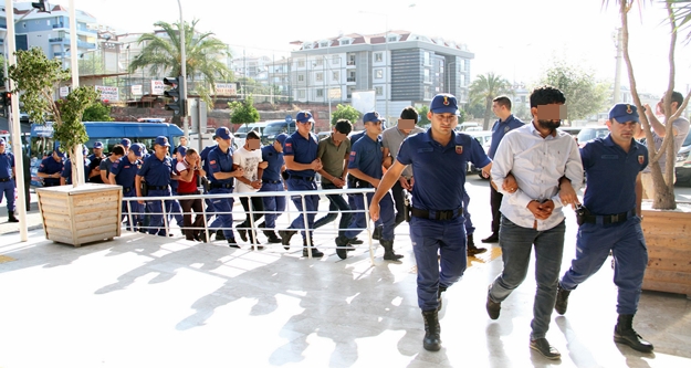 Alanya Cumhuriyet Başsavcılığının koordinesinde Alanya İlçe Emniyet Müdürlüğü Narkotik Grup Amirliği ve Alanya İlçe Jandarma Komutanlığı ekipleri, ‘torbacı“ diye tabir edilen sokak satıcılarına yönelik eş zamanlı operasyon düzenledi. Belirlenen adreslere düzenlenen operasyonda polisin sorumluluk bölgesinde S.A, A.Ç, E.Ü,, A.U, M.T.A, M.E, O.S, A.A. jandarmanın bölgesinde ise V.T, İ.A, H.Ş, A.Ö, Ş.A, A.S, H.K, K.A. ve T.Ö. isimli şüpheliler gözaltına aldı. Adreslerde yapılan aramalarda 31.35 gram eroin, 641.15 gram esrar, 75 gram kokain, 136 kök Hint keneviri, 13.2 gram metamfetamin ile uyuşturucu satışında kullanılan hassas terazi, ruhsatsız tabanca, 2 ruhsatsız av tüfeğiyle bunlara ait çok sayıda mermi ve fişek ele geçirildi.