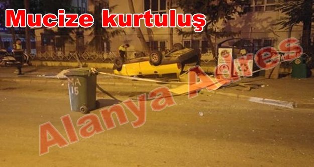 Alanya'da dün gece 01.30 sularında feci bir trafik kazası yaşandı. Alanya Adres'in edindiği bilgilere göre içinde 5 kişinin bulunduğu bir araç Başkent Hastanesi önünde seyir halindeyken virajı alamayınca takla attı. Ters bir şekilde kaldırıma uçan araçta bulunan 5 kişi mucizevi bir şekilde burunları bile kanamadan kendi imkanları ile kapıları kırarak araçtan çıktılar. 2 kadın ve 3 erkeğin bulunduğu araçtan kimsenin burnu bile kanamadan çıkması şans eseri faciayı önledi. Olay yerine gelen polis ve itfaiye ekipleri aracı sabah olmadan çekerek yoldan çıkardılar. Araç tamamen kullanılmaz hale gelirken trafik levhası ve çöp konteynırlarıda zarar gördü.