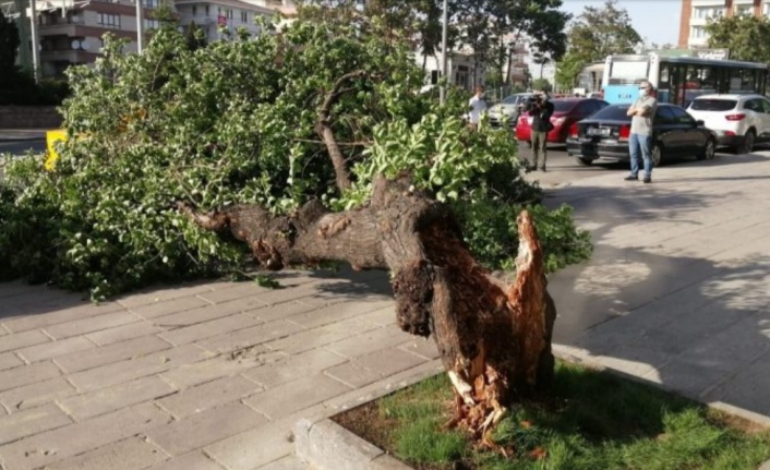 Alanya’da akşam saatlerinde kısa süreliğine etkili olan fırtına ve yağmur, Hayate Hanım İlkokulu yanındaki dev bir ağacı devirdi.
