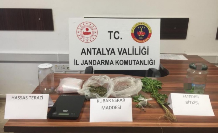 Alanya Cumhuriyet Başsavcılığı koordinesinde Antalya İl Jandarma Komutanlığına bağlı Alanya İlçe Jandarma Komutanlığı ekiplerince Dinek Mahallesi'nde Ö.K. isimli şahsın evinde uyuşturucu madde imal ederek sattığı tespit edildi. Düzenlenen operasyonda 32 kök kenevir bitkisi, 800 gram kubar esrar maddesi ve 1 adet hassas terazi ele geçirildi. Gözaltına alınan şüpheli, işlemlerinin tamamlanmasına müteakip adli makamlara sevk edilecek.