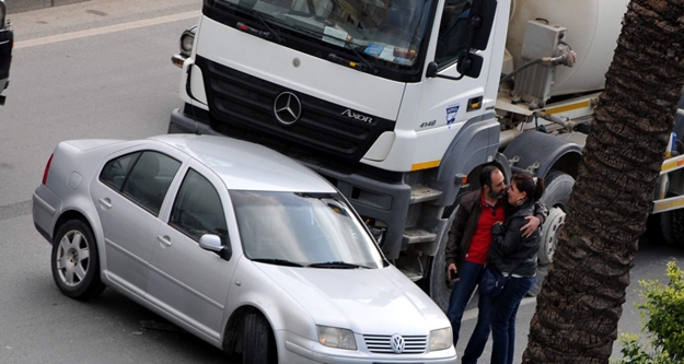 Alanya şehir merkezinde seyir halindeki otomobile beton mikseri çarptı. Kazada yaralanan olmazken araçtaki karı-koca büyük şok yaşadı.