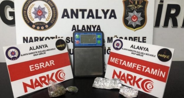 Alanya Cumhuriyet Başsavcılığı koordinesinde Narkotik Suçlarla Mücadele Grup Amirliğince yapılan çalışmalarda Kızlarpınarı Mahallesi Özmüftüoğlu Sokak üzerinde şüphe üzerine durdurulan A.Y.(20) isimli şahsın üzerinde 0,29 gram Metamfetamin maddesi ele geçirildi. Şahsın uyuşturucu maddeyi B.E.(34) isimli şahıstan aldığını ifade etmesi üzerine B.E isimli şahsın ikametinde yapılan aramada 1,56 gram Esrar maddesi, 0,69 gram Metamfetamin maddesi ve 1 adet hassas terazi ele geçirildi. Alanya Cumhuriyet Savcısının talimatı gereği A.Y.(20) isimli şahsa “Uyuşturucu Madde Bulundurmak ve Kullanmak” suçundan işlem yapılarak serbest bırakıldı. Öte yandan B.E.(34) isimli şahsa ise “Uyuşturucu Madde Ticareti Yapmak” suçundan işlem yapıldı. Emniyetteki işlemlerin ardından B.E. isimli şahıs Alanya Adliyesi’ne sevk edildi.