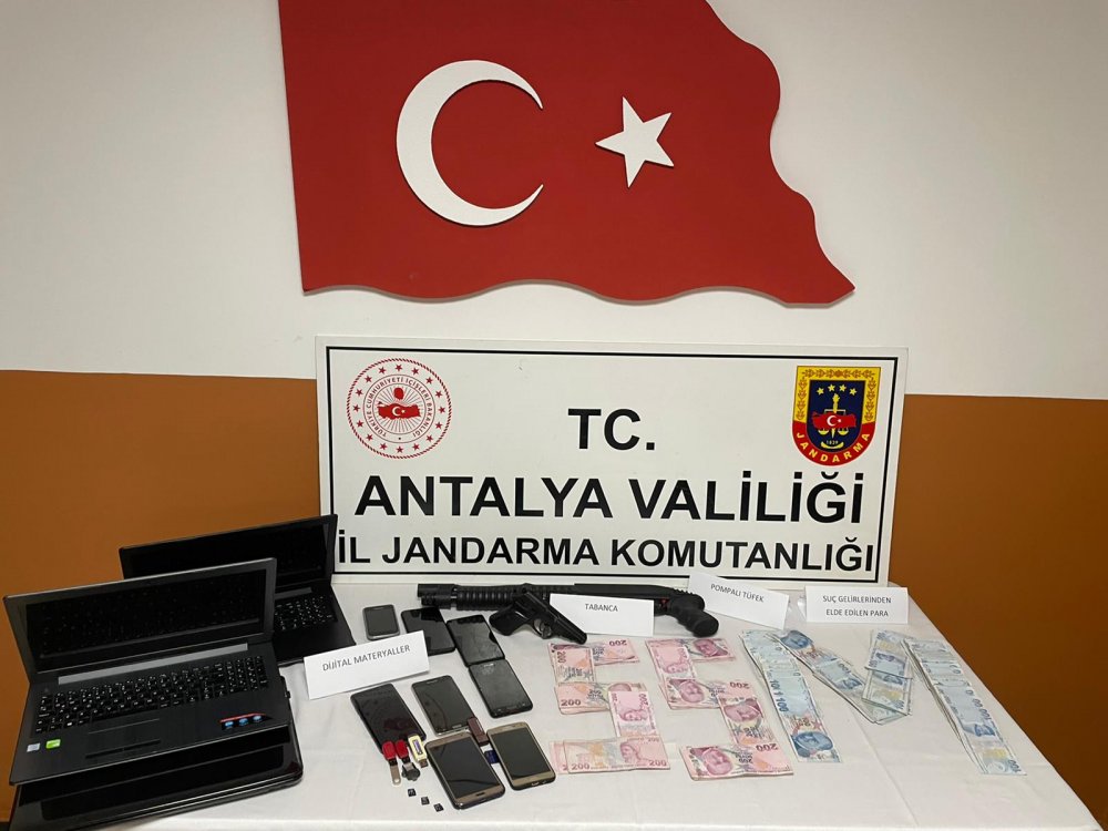 Alanya Cumhuriyet Başsavcılığı koordinesinde; Antalya İl Jandarma Komutanlığı Siber Suçlarla Mücadele Şube Müdürlüğünce Alanya Konaklı Mahallesi'nde faaliyet gösteren cep telefonu ve telefon aksesuarı satışı yapan iş yerinde, 3 şüphelinin yasadışı bahis oynattığı tespit edildi. Dün Alanya'da Jandarma Karakol Komutanlığına bağlı ekiplerin eşlik ettiği operasyonda 4 ayrı adrese de baskın düzenlendi. Operasyonda adreslerde yapılan aramalarda 8 telefon, 3 laptop, 5 sim kartı, 5 hafıza kartı, 6 USB bellek, kuru sıkı tabanca ve pompalı tüfek ile bahisten elde edildiği değerlendirilen 48 bin 400 TL ele geçirildi. Olayla ilgili gözaltına alınan 3 şüpheli çıkarıldıkları mahkemede tutuklanarak cezaevine gönderildi.