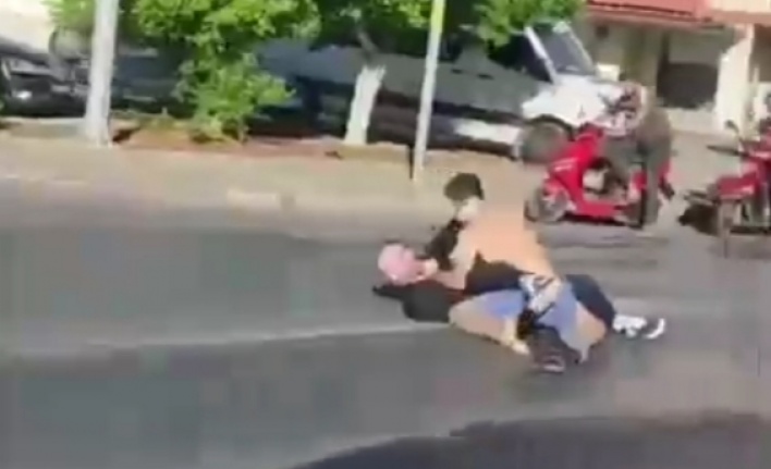 Alanya'da 1'i yaşlı 2 kişi yolun ortasında akan trafiğe aldırış etmeden yumruk yumruğa kavga etti.