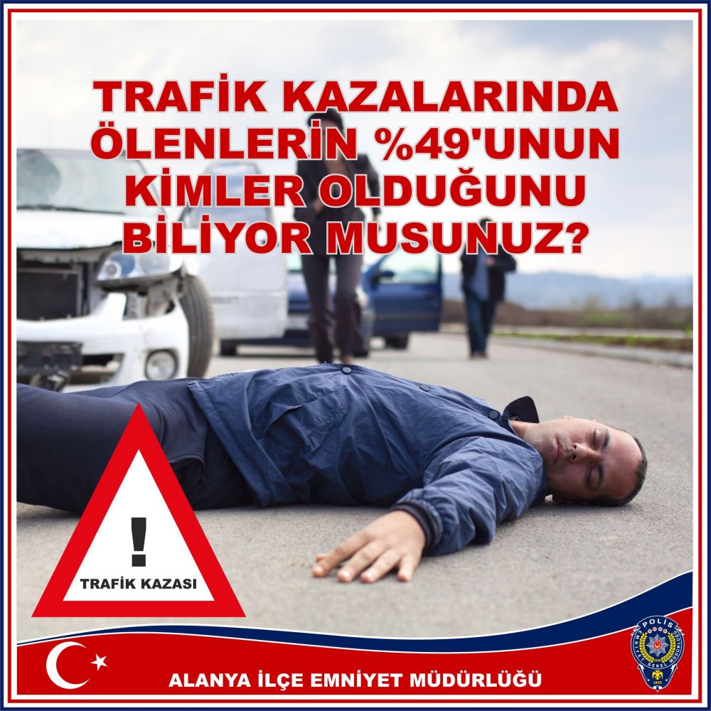 Alanya İlçe Emniyet Müdürlüğü'nde yapılan açıklama şu şekilde: 'Ülkemiz karayolu ağında 2020 yılında gerçekleşen trafik kazalarında ölen kişilerin %49,4'ünün sürücü, %30,7'sinin yolcu, %19,9'unun ise yaya olduğu görülmüştür. Trafik kazalarında ölenler ve yaralananlar cinsiyetlerine göre incelendiğinde ise ölenlerin %79,7'sinin erkek, %20,3'ünün kadın, yaralananların ise %71,4'ünün erkek, %28,6'sının kadın olduğu tespit edilmiştir.Kazaya neden olan kusurlar içinde sürücü kusurları %88,3 ile ilk sırada yer almaktadır. Türkiye'de 2020 yılında ölümlü yaralanmalı trafik kazasına neden olan toplam 177 bin 867 kusura bakıldığında, kusurların %88,3'ünün sürücü, %7'sinin yaya, %2,7'sinin taşıt, %1,4'ünün yolcu ve %0,5'inin yol kaynaklı olduğu görülmüştür.'
