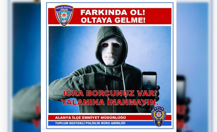 Alanya İlçe Emniyet Müdürlüğü Toplum Destekli Polislik (TDP) Büro Amirliği vatandaşı ‘İcra borcunuz var’ denilerek yapılan dolandırıcılığa karşı uyardı.