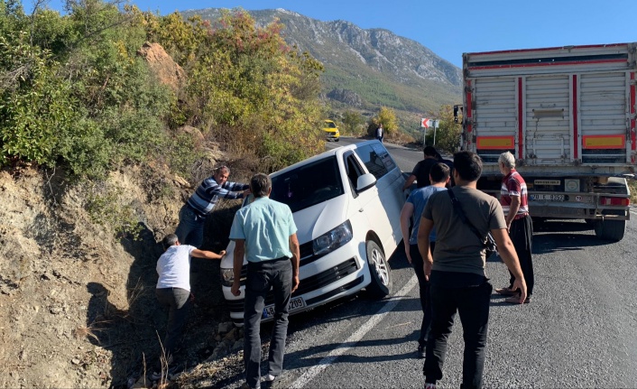 Alanya Çayarası yolunda meydana gelen kazada kamyonun sıkıştırdığı bir minibüs şarampole devrildi.