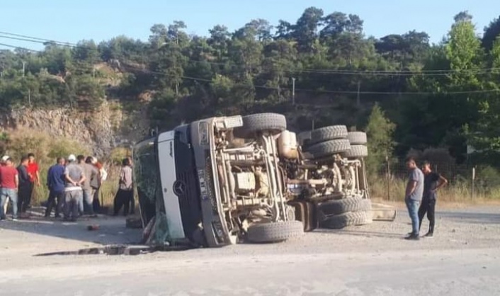 Alanya’nın doğusundaki Demirtaş Mahallesi’nde virajı alamayan beton mikseri yan yattı. Kaza yerine çok sayıda vinç ve diğer kurtarma araçları geldi. Maddi hasar meydana gelen kazada, beton mikseri büyük vinçler tarafından kaldırıldı.