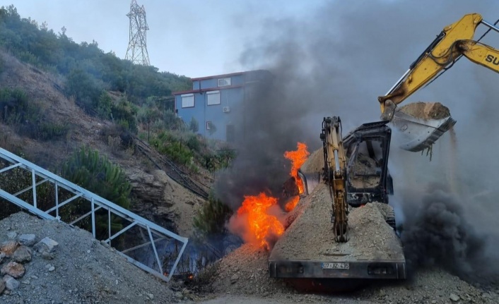 Alanya’da iş makinesinin elektrik tellerine takılması sonucu çıkan yangın da kamyon ve üzerindeki iş makinesi kullanılmaz hale geldi.