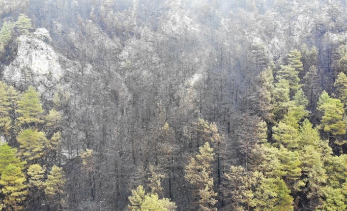 Yangın hasarı da gün ışığıyla ortaya çıktı. Günün ağrımasıyla gece alevlerin yükseldiği bölgelerde yanan orman İhlas Haber Ajansı (İHA) tarafından havadan görüntülendi.