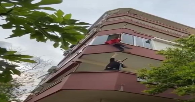 Alt kattaki komşusunun balkonuna çıkıp ipe tutunan genç adam, 3. kattaki arkadaşlarının ipi çekmesiyle 2. kattaki evinin penceresinden içeriye girdi.
