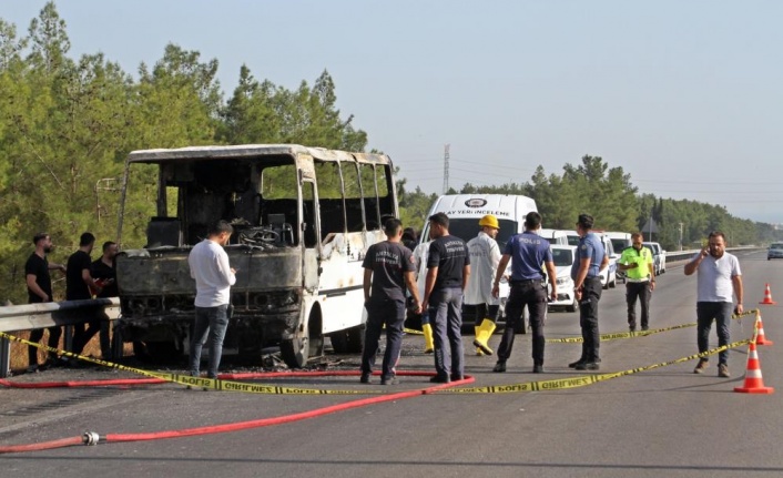 Antalya’da karavana çevrilen midibüs alev alev yandı, araçtaki bir kişi feci şekilde yanarak can verdi. Görgü tanıklarının ifadelerine göre midibüsteki kişinin en son alevleri söndürmeye çalıştığı belirtilirken, polisin araç içerisinde yaptığı incelemede de cesedin yanında yangın tüpünün olduğu öğrenildi.