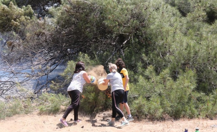 Diğer taraftan yangının olduğu gören vatandaşlar ormanlık alana koştu. Kadınlar ellerine aldıkları kovalar ile yangına kum atarak ekiplere yardım etti. Bir genç ise 2 kilometre koşarak ekiplere içecek su yetiştirdi. Diğer vatandaşlar ise itfaiye araçlarının hortumlarının çekilmesinde ekiplere destek verdi. Bir başka vatandaş ise yangın alanında bulunan bir köpeği yanından götürerek alandan uzaklaştırdı.