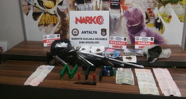 Antalya Emniyet Müdürlüğü Narkotik Suçlarla Mücadele Şube Müdürlüğü ekipleri, Muratpaşa ilçesinin Yeşildere 5, Gebiz ve Doğuyaka Mahallesinde 7 adrese Çevik ve Yunus timlerinin katılımıyla eş zamanlı operasyon düzenlendi. İkametlerde yapılan aramada, 63 paket skunk, 4 gram esrar, 114 ecstasy hap, 3 tüfek, 83 fişek ve bir miktar para ele geçirildi. Olayla ilgili gözaltına alınan 1’i çocuk 4 şüpheli emniyetteki işlemlerinin ardından adliyeye sevk edildi.