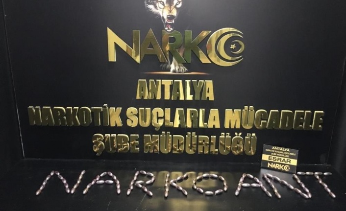 Antalya İl Emniyet Müdürlüğü Narkotik Suçlarla Mücadele Şube Müdürlüğü Hudut Kapıları Büro Amirliği tarafından il genelinde uyuşturucu maddelerin kaynağının kurutulması, ticaretinin ve kullanımının engellenmesi amacıyla Antalya Cumhuriyet Başsavcılığı koordinesinde yürütülen çalışmalar doğrultusunda düzenlenen operasyonda uyuşturucu madde ele geçirildi.Antalya Havalimanı'na gelen Fas uyruklu H.L.'nin şüpheli tavırlar sergilemesi üzerine Narkotik Suçlarla Mücadele Şube Müdürlüğü Hudut Kapıları Büro Amirliği ekiplerince yaptırılan iç beden muayenesinde 100 adet kapsül halinde daralı bin 100 gram macun esrar maddesi yakalandı. Gözaltına alınan şüpheli H.L. hakkında “Uyuşturucu veya Uyarıcı Madde Ticareti Yapma veya Sağlama” suçlarından işlem yapıldı.