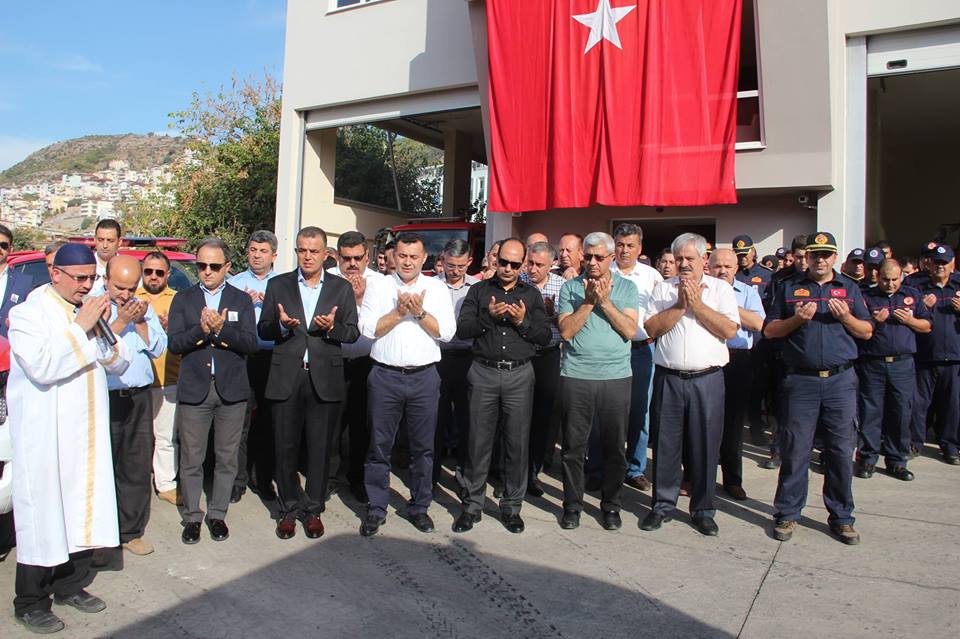 Dün Alanya'nın Süleymanlar Mahallesi'nde çıkan yangına müdahale için Güzelbağ istasyonundan hareket eden itfaiye aracının uçuruma yuvarlanması sonucunda yaşamını yitiren itfaiye eri Cengiz Bayındır için tören düzenlendi.