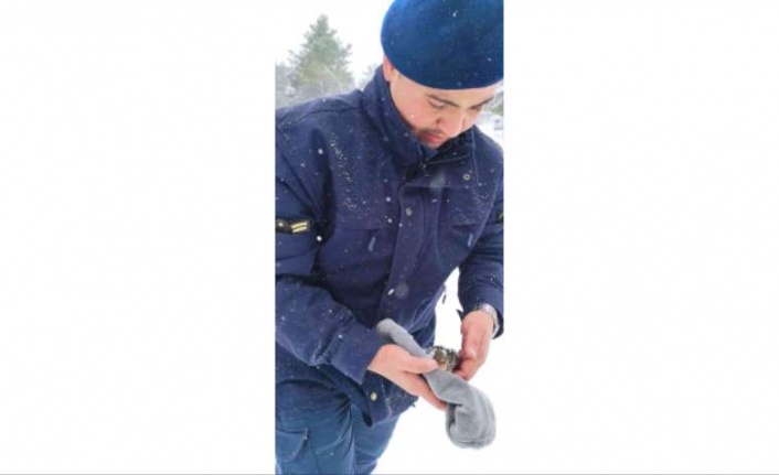 Jandarma, soğuktan donmak üzere olan kuşu kendi kıyafetiyle ısıttı