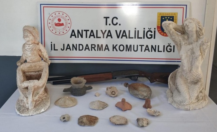 Antalya'da jandarma tarafından yapılan operasyonda Roma dönemine ait olduğu değerlendirilen taş ve bronz objeler ele geçirildi.
