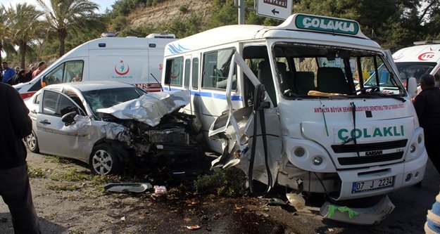 Kaza, dün akşam saatlerinde Antalya'nın Manavgat ilçesinde meydana geldi. Edinilen bilgiye göre Antalya istikametinden Manavgat istikametine seyir halindeki Yaşar Yalçın B.’nin kullandığı 07 LCS 92 plakalı otomobilin Çolaklı Kamelya kavşağında kırmızı ışıkta beklemekte olan Tevfik Y.’nin kullandığı 07 J 2234 plakalı yolcu minibüsüne çarptı. Otomobilin kontrolden çıkıp önce refüje çıktığı, aydınlatma direğini yıktığı ve yaklaşık 50 metre refüjde ilerledikten sonra minibüse çarptığı iddia edildi. Kazada otomobil sürücüsü Yaşar Yalçın B., yanında bulunan Ahmet M. minibüs sürücüsü Tevfik Y. ile yolculardan Abdülbaki E., Aslı C. ve İrfan T. ile isimleri belirlenemeyen 2 yolcu yaralandı.