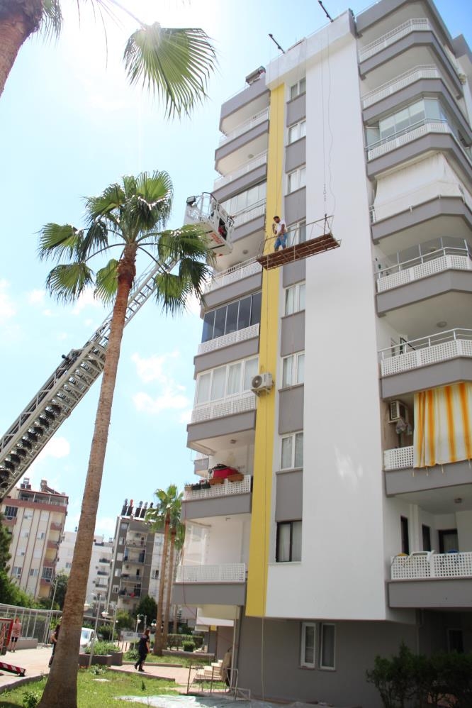 Olay, saat 10.40 sıralarında Konyaaltı ilçesi Siteler Mahallesi’ndeki bir sitenin B blokunda meydana geldi. Edinilen bilgiye göre bir süre önce sitenin dış cephesine boya yapan Abdülkadir Uçun (30), eksik kalan yerleri tamamlamak için bugün 8 katlı B bloka iskele sitemi kurdu. Beline güvenlik kemerleri bağlı şekilde boyama işlemi yapan Uçun’un üzerinde bulunduğu iskelenin halatlarından biri boşa düştü. 3 kat zemine doğru hızla düşen iskele bağlı olan diğer halatların tutmasıyla bir anda durdu. Sistemin çalışmaması üzerine iskelede mahsur kalan Uçun, durumu 112 Acil Çağrı Merkezine bildirdi. İhbarla bölgeye, Büyükşehir Belediyesi İtfaiye ekipleri sevk edildi. 5. kattaki iskelede kalan Uçun, itfaiyenin açtığı merdivenin taşıma bölümüne alındı. Sakin olduğu gözlemlenen Abdülkadir Uçun, itfaiye aracından inerek, bir süre çalıştığı yere baktı ve daha sonra binanın içine girdi. Vatandaşlar da kurtarma çalışmasını endişeli gözlerle izledi.