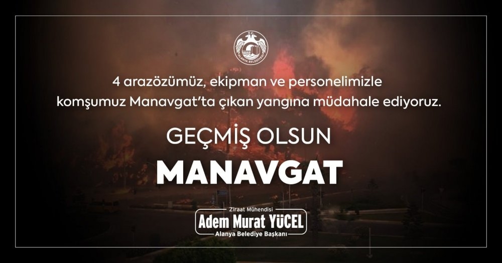 Başkan Yücel açıklamasında, “Geçmiş olsun Manavgat... 4 arazöz, ekipman ve personellerimizle birlikte komşumuz Manavgat'taki yangının söndürülmesi için destek oluyoruz. Yangının can ve mal kaybı olmadan bir an önce kontrol altına alınmasını diliyor, Manavgat halkına geçmiş olsun dileklerimi iletiyorum. Dualarımız sizlerle” ifadelerini kullandı