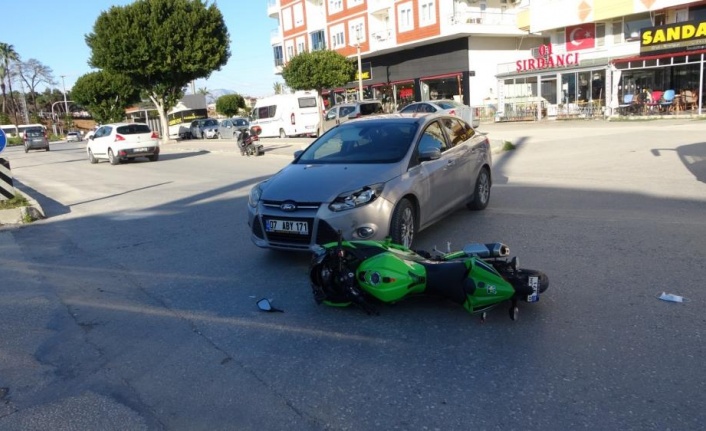 Antalya'nın Manavgat ilçesinde motosikletin, tali yoldan çıkan otomobile çarpması sonucu meydana gelen kazada motosiklet sürücüsü hafif yaralandı.