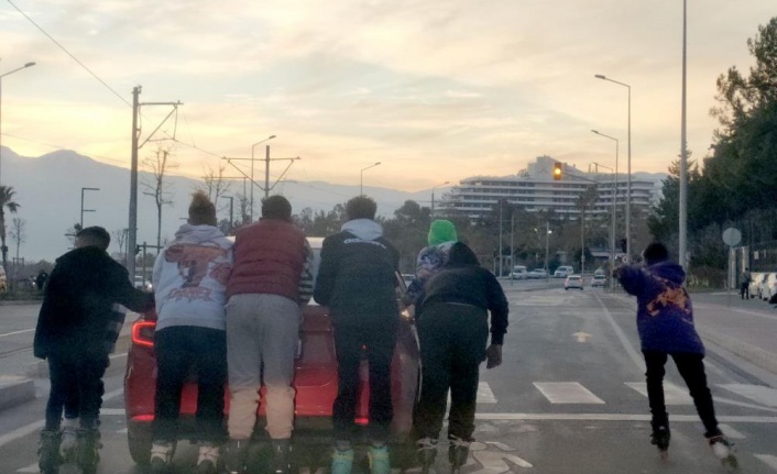 Antalya’nın Muratpaşa ilçesinde 8 patenli çocuğun, otomobile tutunarak yaptıkları tehlikeli yolculuk kameralara yansıdı. Sürücüleri zor durumda bırakan çocukların, kırmızı ışıkta dans etmeleri ise pes dedirtti.