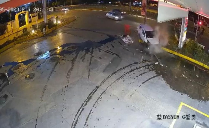 Antalya'da polisin ‘dur' ihtarına uymayan otomobil sürücüsü, ekiplerden kaçarken akaryakıt istasyonun önündeki refüje çarptı. Polis tarafından yakalanan yaralı sürücü gözaltına alınırken, olay anı saniye saniye güvenlik kamerasına yansıdı.