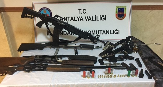 Antalya İl Jandarma Komutanlığı ekipleri silah ve mühimmat kaçakçılığı suçu ile mücadele kapsamında Manavgat’ın Şelale Mahallesi'nde ikamet eden P.Y.’nin evine operasyon düzenledi. Operasyonda, 3 adet 7,65 mm ruhsatsız tabanca, 2 adet 7,65 mm tabanca şarjörü, 13 adet 7,65 mm tabanca fişeği, 5 adet namlusu dönüştürülmüş kurusıkı tabanca, 8 adet kuru sıkı tabanca şarjörü, 2 adet kurusıkı tabanca fişeği, 1 adet namlusu ve kabzesi bulunmayan bila nolu tabanca, 4 adet av tüfeği, 2 adet av tüfeği şarjörü, 14 adet av tüfeği fişeği, 2 adet av tüfeği mekanizması, 1 adet av tüfeği namlusu ve 4 kök kenevir bitkisi ele geçirdi.