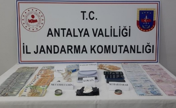 Edinilen bilgiye göre, Manavgat Cumhuriyet Başsavcılığının koordinesinde; ilçede uyuşturucu madde imal ve ticareti yapan şahısların tespiti ve yakalanmasına yönelik çalışma yürütüldü. Yürütülen çalışmalar çerçevesinde, F.H. isimli şahsın kiraladığı araçla İstanbul’dan uyuşturucu madde getirerek ilçedeki turizm bölgesinde piyasaya süreceği tespit edildi. Tespit üzerine Antalya İl Jandarma Komutanlığı İstihbarat Şube Müdürlüğünce, Manavgat İstihbarat Kısım ve Çolaklı Jandarma Karakol Komutanlığı ekipleri ile birlikte Evrenseki Mahallesi’nde bulunan bir rezidansta yapılan aramada; 118 gram kokain, 5 gram kubar esrar, 1 gram metamfetamin, 1 adet hassas terazi, 3 bin 400 dolar, bin 400 euro, 28 bin 850 TL olmak üzere toplam 113 bin 731 TL uyuşturucu madde satışından elde edildiği değerlendirilen para ele geçirildi.