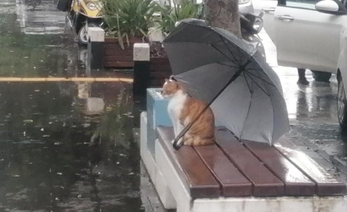 Yağmurda ıslanmasın diye şemsiyesini kedinin üzerine açıp gitti