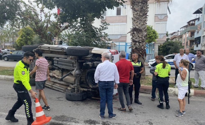 Antalya’da kontrolsüz kavşakta otomobil ile kamyonetin çarpışması sonucu meydana gelen kazada yan yatan kamyonetin sürücüsü kazayı yara almadan atlattı.