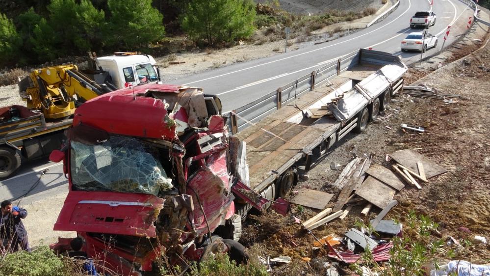 Manavgat'ta tomruk yüklü tırın bariyerlere çarptıktan sonra devrilmesi sonucu meydana gelen kazada, tır sürücüsü ağır yaralandı.