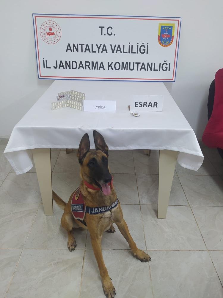 İl Jandarma Komutanlığına bağlı Gazipaşa ilçesi Güney Jandarma Karakol Komutanlığı ekipleri, şehirler arası yolcu otobüsünde yaptıkları kontrolde bir şahsın hareketlerinden şüphelendi. KOM Şube Narkotik köpeği 'Varan' ile otobüsün bagajında A.K.'nin eşyaları arasında 150 miligram uyuşturucu madde, 300 miligram uyuşturucu hap, 5 gram esrar ele geçirildi. Olayla ilgili soruşturmanın devam ettiği bildirildi.