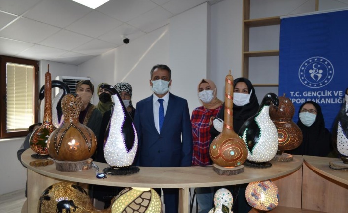 Sergilenen ürünleri inceleyen Kaymakam Ahmet Hikmet Şahin ve Gençlik ve Spor İl Müdürü Yavuz Gürhan, kursiyerlerden yaptıkları çalışmalar hakkında bilgiler aldı.