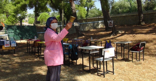 Antalya’nın Manavgat ilçesinde bir ortaokulun 8. sınıf öğrencileri, bir döneme damga vuran Hababam Sınıfı filmindeki gibi, destekleme ve yetiştirme kursunu okul bahçesinde çam ağaçları arasında kurulan açık sınıfta görüyor. Korona virüs tedbirleri kapsamında maskeleriyle okullarının yanındaki çamlık alana gelen öğrenciler, Hababam Sınıfı'nın nostaljik zilinin çalmasıyla birlikte ellerini dezenfekte edip, sosyal mesafeye uygun şekilde sıralarına oturuyor.