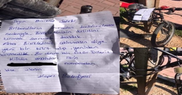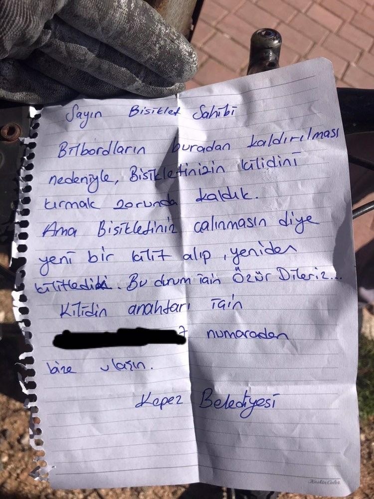 Ekipler notta şu ifadelere yer verdi: ”Sayın bisiklet sahibi billboardların buradan kaldırılması nedeniyle, bisikletinizin kilidini kırmak zorunda kaldık. Ama bisikletiniz çalınmasın diye yeni bir kilit alıp yeniden kilitledik. Bu durum için özür dileriz. Kilidin anahtarı için telefon numarasından bize ulaşın, Kepez Belediyesi.”