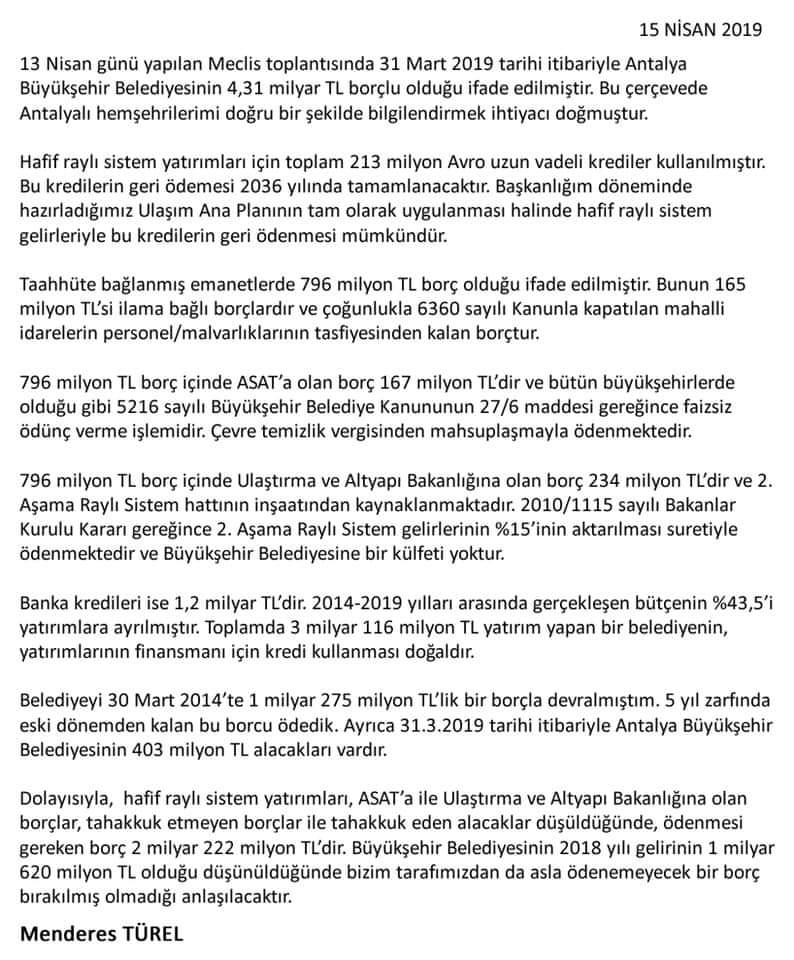 Antalya Büyükşehir Belediye Başkanı Muhittin Böcek'in belediyeyi 4.3 milyarlık borçla devraldığını açıklamasının hemen ardından eski başkan Menderes Türel'den yanıt geldi